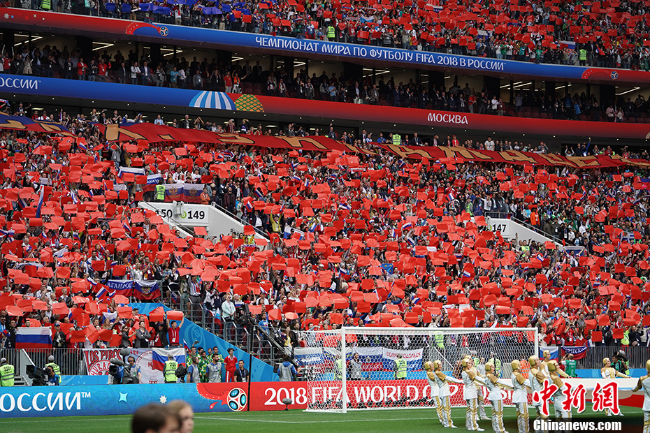 北京时间6月14日23点,俄罗斯世界杯揭幕战在莫斯科卢日尼基体育场打响,东道主俄罗斯对阵沙特阿拉伯。凭借着替补登场的切里舍夫梅开二度,以及加津斯基、久巴和戈洛温的进球,东道主俄罗斯5-0大比分击败沙特阿拉伯,赢得开门红。图为现场热情的球迷。中新社记者毛建军摄