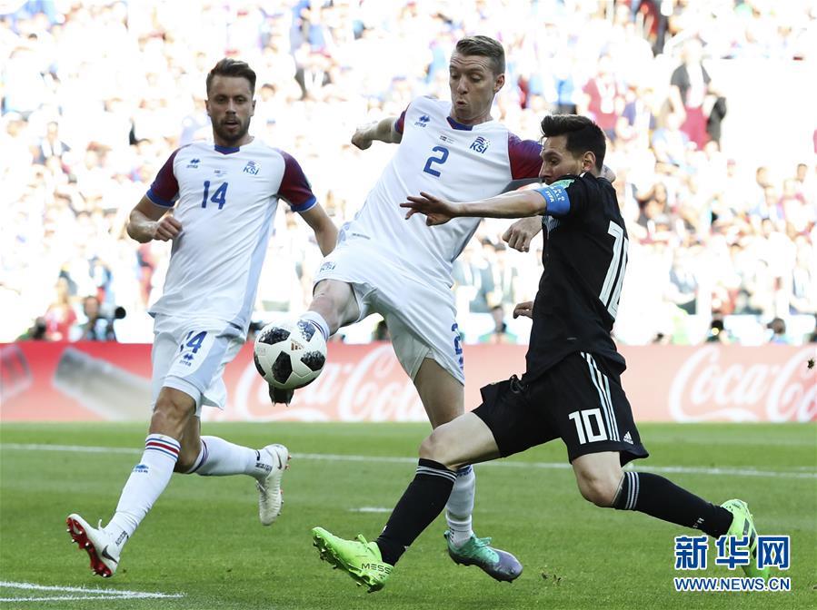 6月16日,阿根廷队球员梅西(右)在比赛中与冰岛队球员塞瓦松(中)拼抢。当日,在莫斯科进行的2018俄罗斯世界杯足球赛D组小组赛中,阿根廷队以1比1战平冰岛队。 新华社记者 曹灿 摄