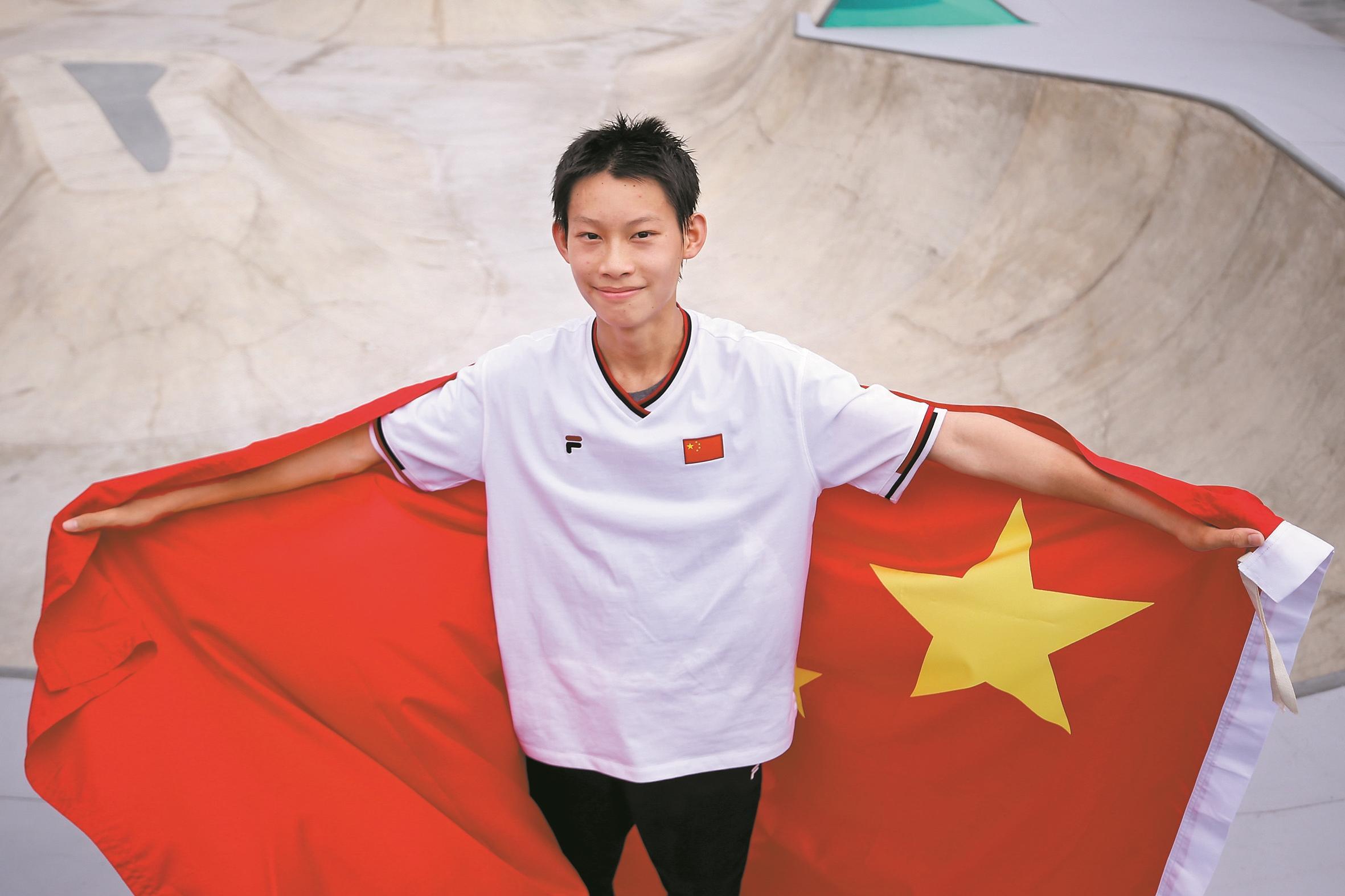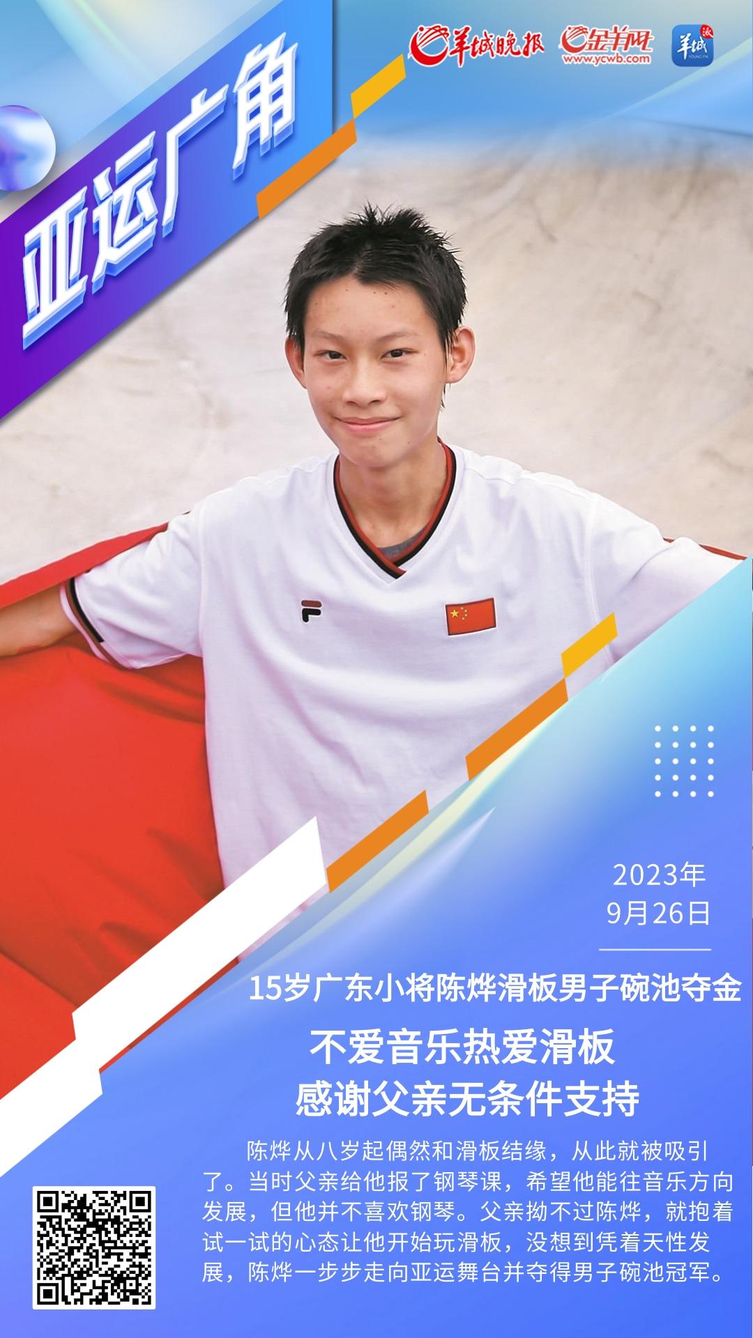 9月25日,在杭州亚运会滑板男子碗池决赛中,来自广东的中国滑板队15岁小将陈烨发挥出色,夺得冠军。