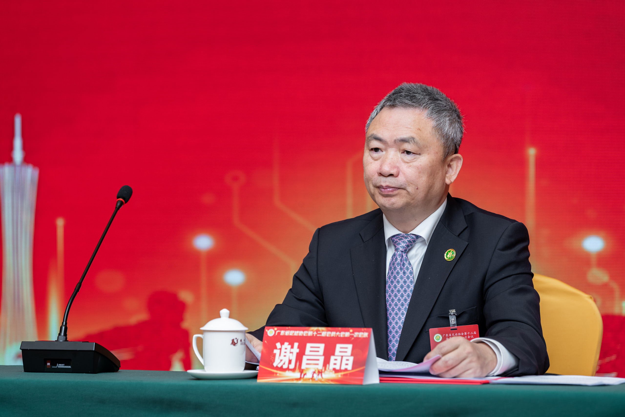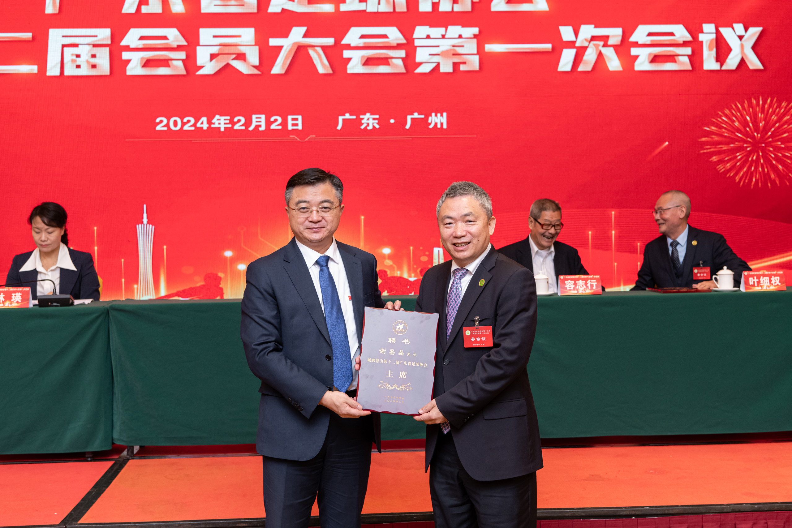 广东省体育局局长崔剑向新一任广东省足协名誉主席叶细权、主席谢昌晶颁发聘书。中国足球协会副秘书长罗钊向大会宣读了中国足球协会的贺信。广东省体育局副局长林瑛代表省体育局在会上对广东省足协过去三年的成绩给予肯定,她希望广东省足协新一届理事会团结带领全省足球工作者,全面落实广东省政府《关于加快推动广东足球高质量发展的意见》,按足球发展规律办事,把纪律和规矩挺在前,积极务实推进广东足球高质量发展。