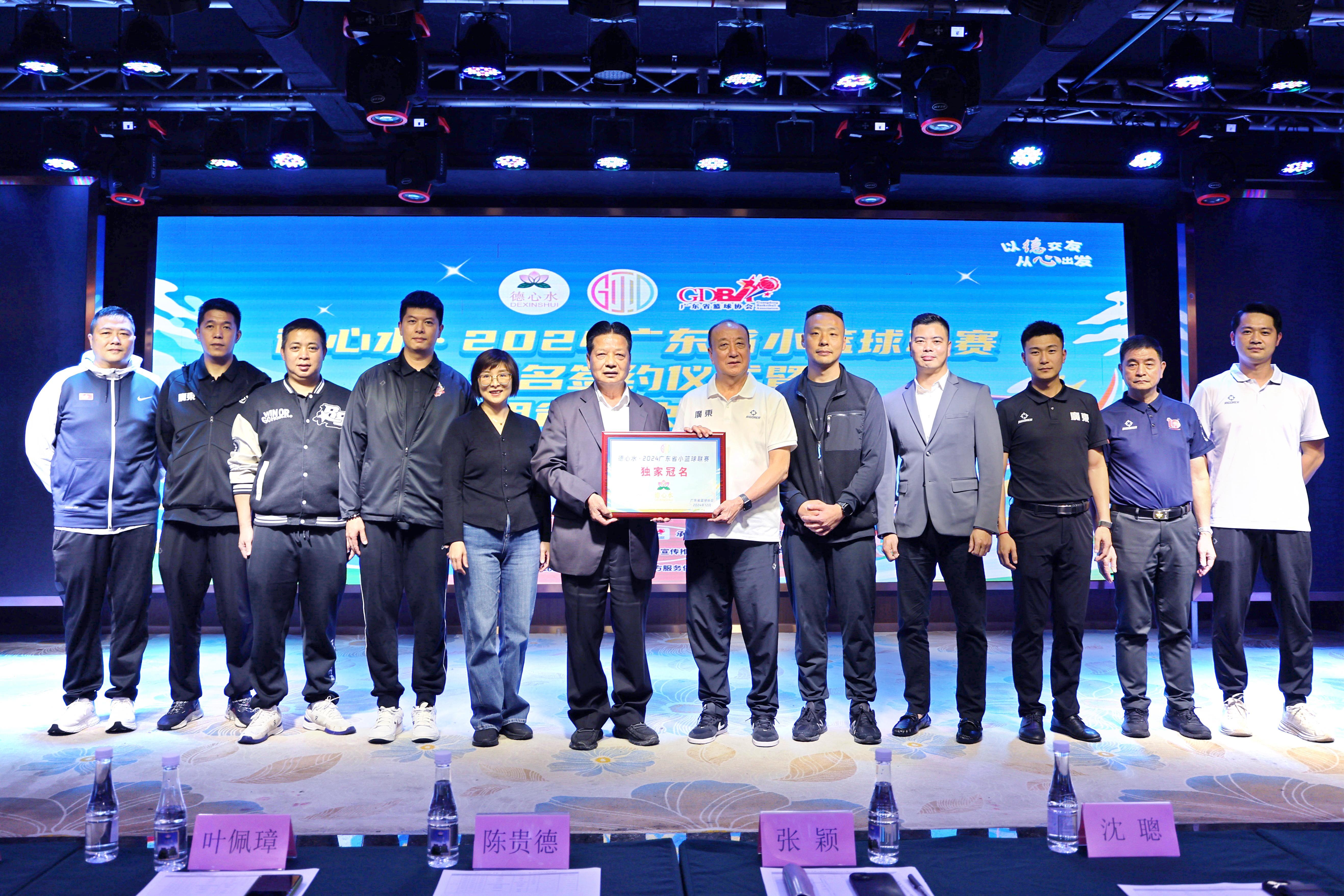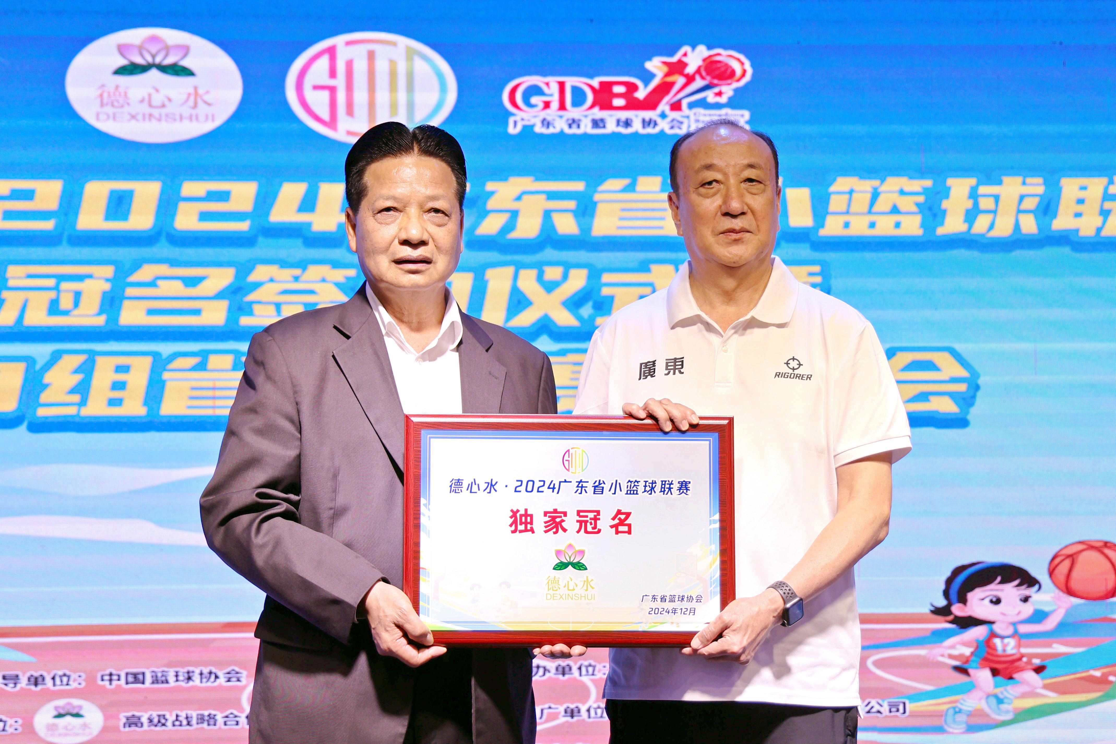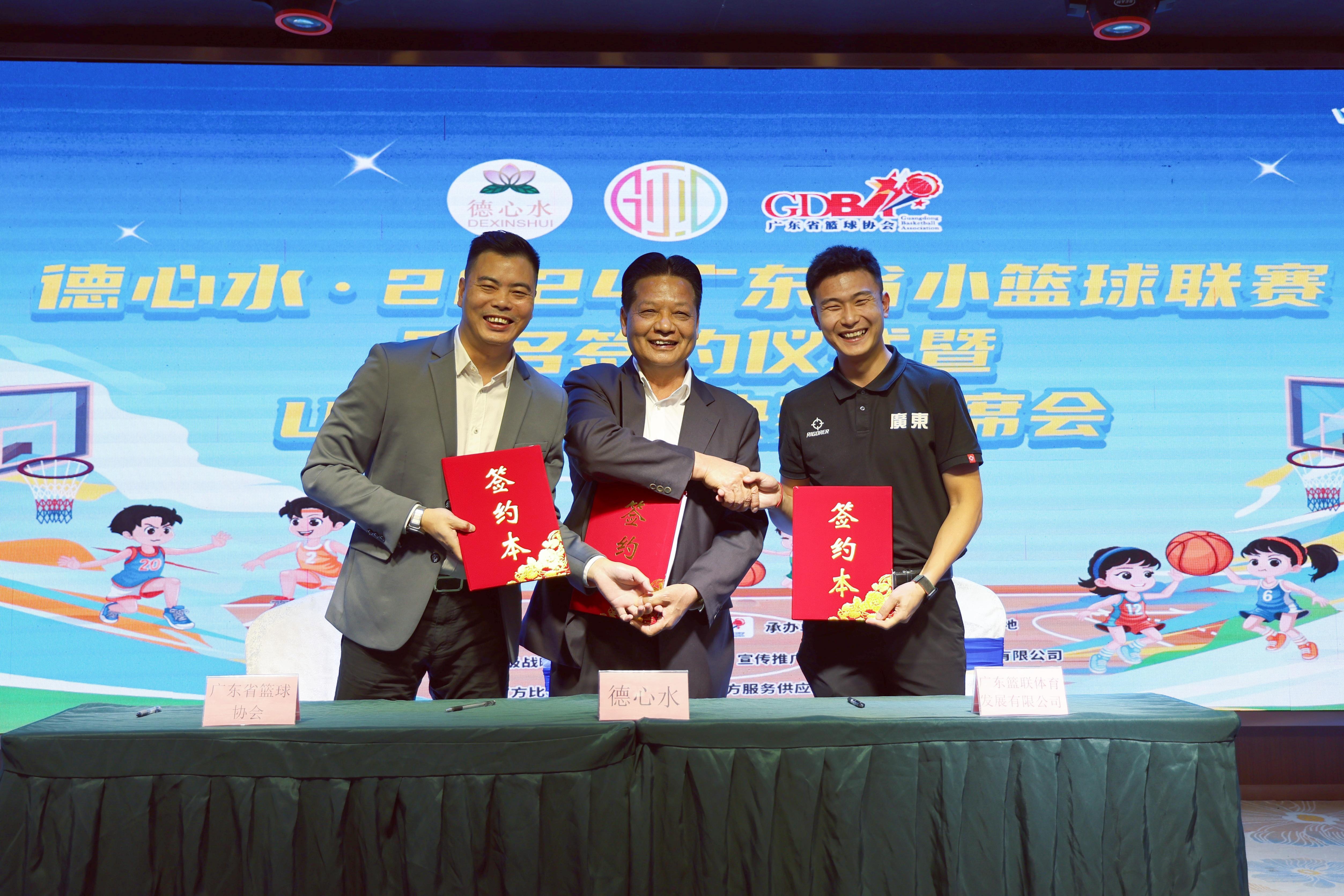 签约仪式上,东莞市贵德实业投资有限公司董事长、德心水创始人陈贵德与广东省篮球协会秘书长林广宇、广东篮联体育发展有限公司代表周嘉瑞共同完成签约。广东省篮球协会副会长张颖代表广东省篮球协会向陈贵德董事长赠送冠名赞助商牌匾。陈贵德表示,将在未来五年,携手广东省小篮球联赛,以德交友,从心出发,让全省篮球儿童在本项赛事中培养篮球兴趣,强身健体的同时,树立良好个人品德,长久受益。