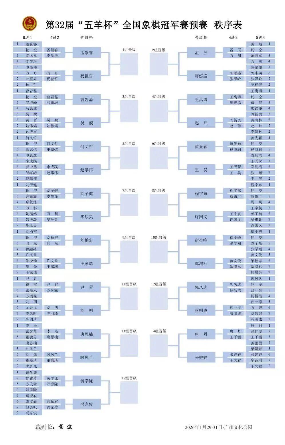 随着第二比赛日结束,第32届“五羊杯”预赛即将迎来最终决战。1月31日,预赛第三比赛日将进行小组决赛,12个男子组、2个女子组、1个港澳台组将各自决出唯一晋级名额,15个决赛席位全部出炉。男子组,孟繁睿和杨世哲的较量将成为最大焦点;女子组,时凤兰遭遇唐思楠,“十冠王”唐丹则将迎战状态正佳的张婷婷;港澳台组,黄学谦将和冯家俊争夺一个出线席位。
