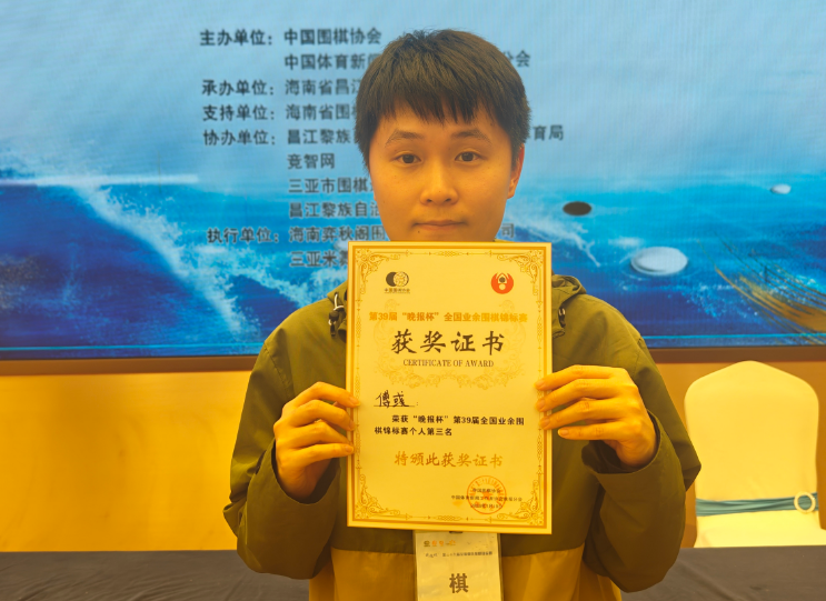 1月10日,第三十九届“晚报杯”全国业余围棋锦标赛(以下简称“晚报杯”)在海南昌江落下帷幕。经过六天13轮的激烈对抗,四川围棋协会队选手陈扬8段以12胜1负蝉联冠军,上海黄浦围棋协会桥旦队陈镱夫8段以11胜2负获得亚军,羊城晚报广东东湖棋院队选手、25岁的傅彧8段以10胜3负获得季军。根据竞赛规程,由于前两名选手都曾为职业棋手,因此傅彧获得代表中国参加新一届世界业余围棋锦标赛的资格。