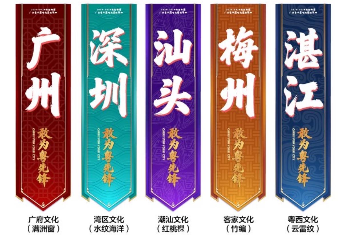 如果说标志和吉祥物是赛事的“面子”,那么代表广府、湾区、潮汕、客家、粤西五大文化赛区的系列战旗,则是连接选手与地域文化认同的“里子”。设计采用传统旌旗造型框架,期盼让其化身为电竞场景里的文化符号载体。