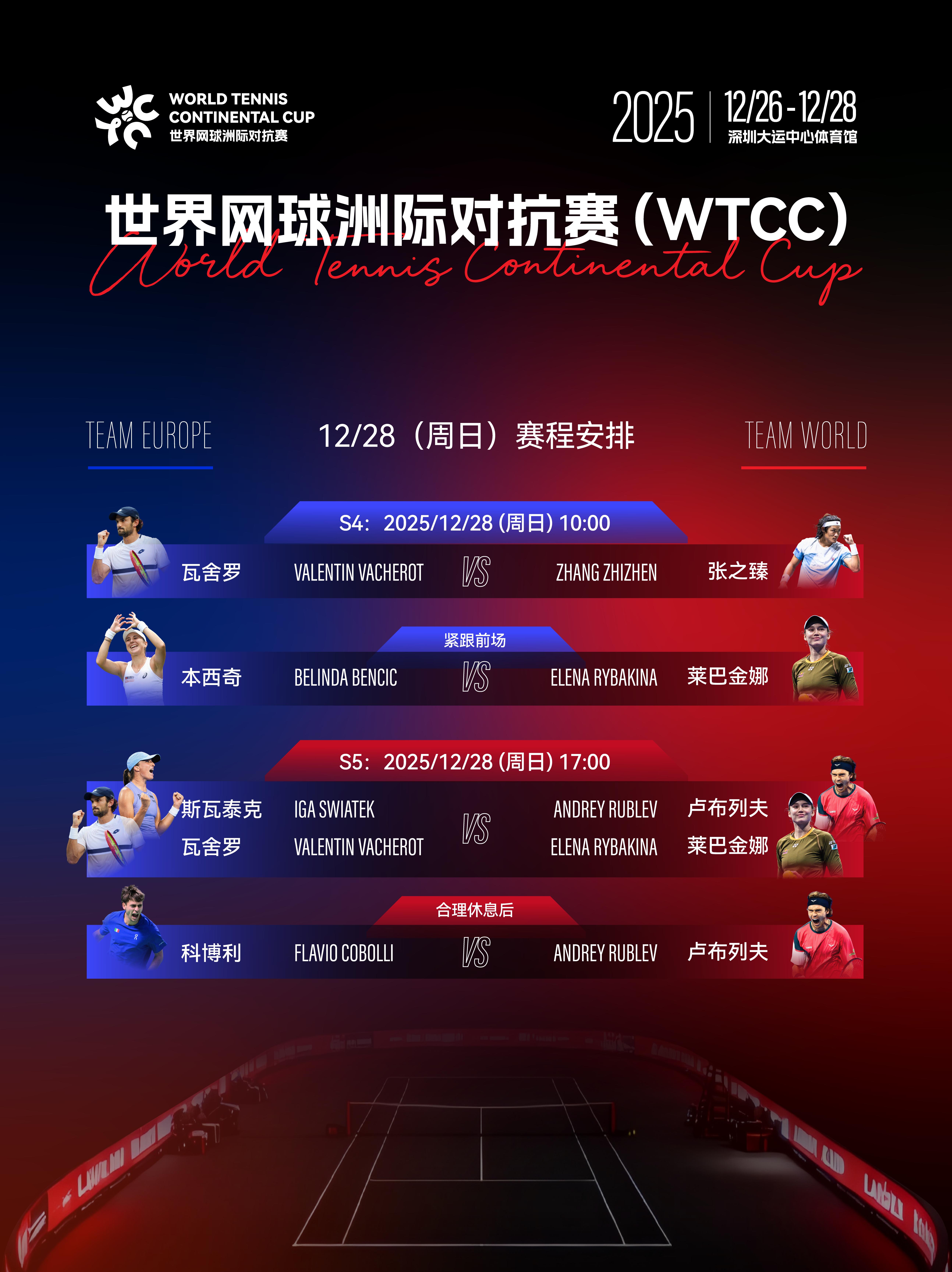 12月27日,2025世界网球洲际对抗赛(WTCC)在深圳大运中心体育馆展开S2、S3赛段的角逐。欧洲队与世界队的顶尖网球明星悉数登场,联袂献上3场巅峰单打对决与1场精彩混合双打对战。