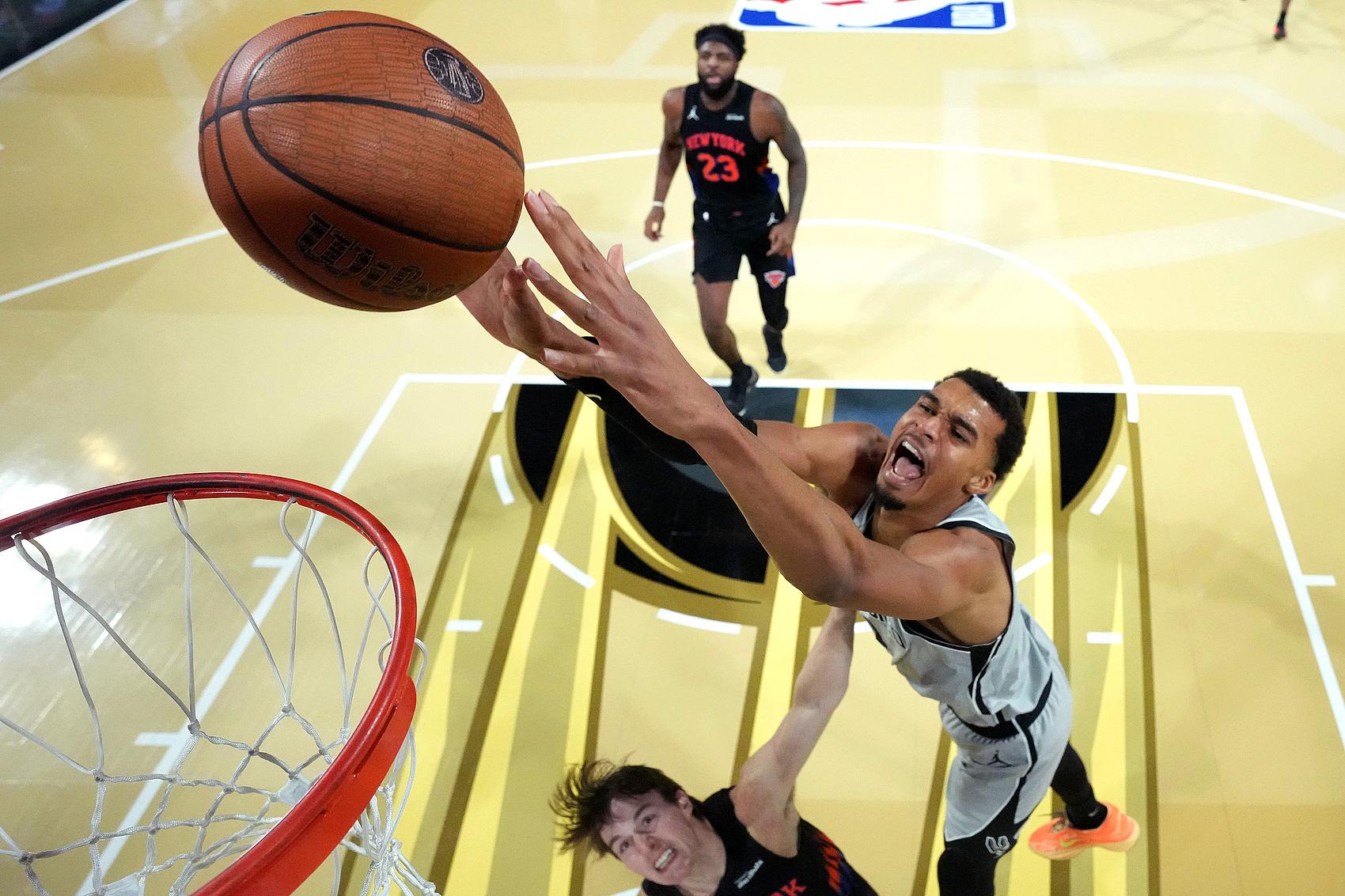 易边再战,马刺当家后卫福克斯连续两记三分得手吹响进攻号角,文班亚马在本节后半段再度登场后改变比赛策略,更多依靠接球中远投惩罚尼克斯队防线,他在7分钟里7投5中独砍12分,帮助马刺以5分优势进入末节;末节决战,尼克斯队主帅迈克·布朗重用替补中锋罗宾逊和替补后卫克拉克森,两人连续冲抢前场篮板并命中三分,一举将分差拉开至7分左右,马刺队两大核心文班亚马和福克斯则在本节完全迷失,尼克斯在本节打出35比19的单节比分,最终以124比113取胜,夺得本赛季NBA杯冠军。