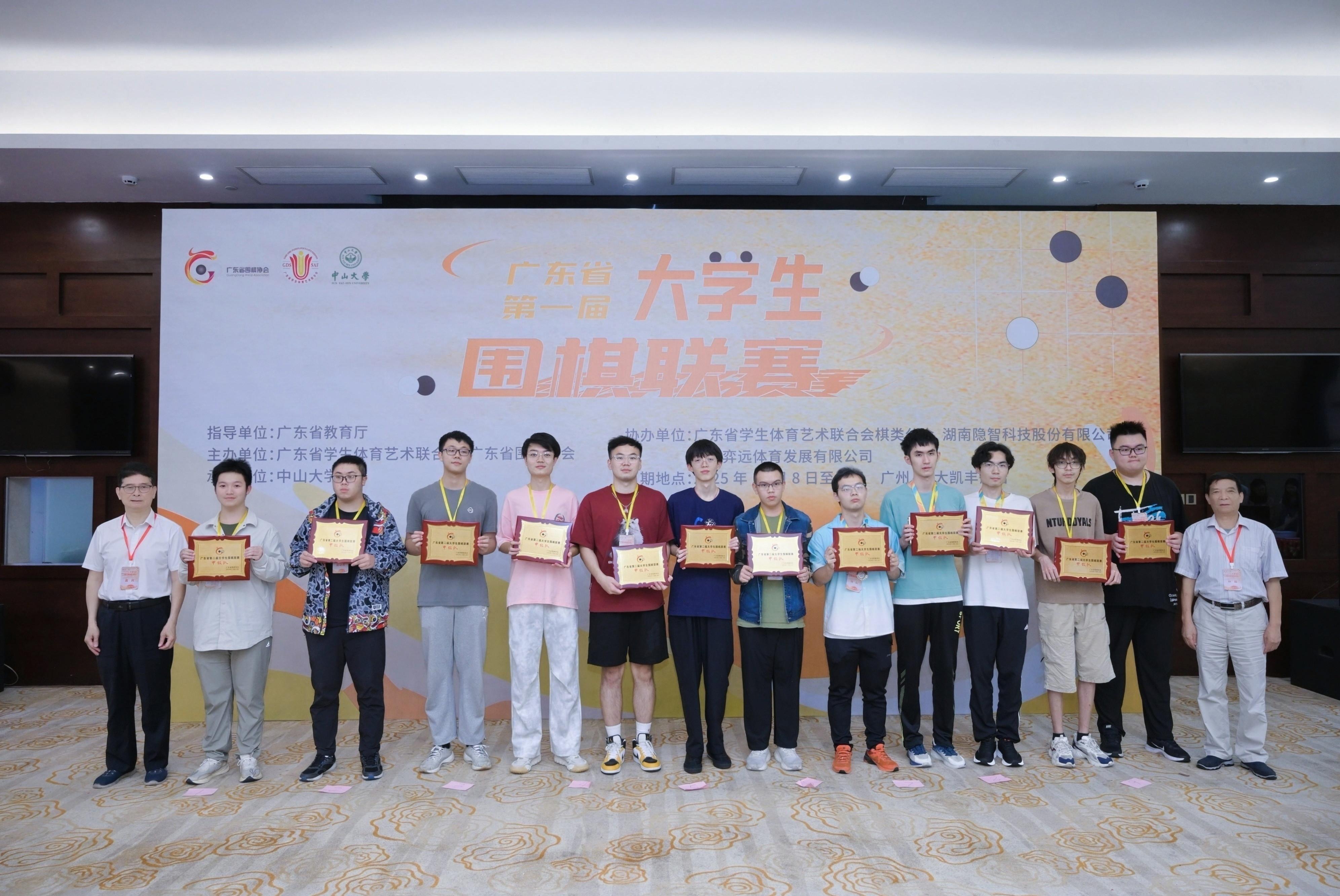本届联赛吸引来自全省28所高校的65支队伍、近200人踊跃参赛,其中包括60多位5段以上的业余高手,尽显大湾区高校围棋运动的深厚基础与青春活力。比赛采用3人团体定台制,经过六轮激烈角逐,各奖项尘埃落定:香港中文大学(深圳)一队摘得桂冠,中山大学一队、华南理工大学一队分获亚季军,前十二名队伍成功晋级下一届联赛甲级队;香港中文大学(深圳)一队的薛溪缙、华南农业大学一队的郑之灏、中山大学一队的覃国友分获“最佳一台”“最佳二台”“最佳三台”,覃国友在本次大赛晋升业余6段。此外,组委会向中山大学、华南理工大学、暨南大学等24所高校颁发优秀组织单位奖,向广东海洋大学等高校颁发荣誉组织单位奖,向中山大学、广东省学生体育艺术联合会棋类分会、湖南隐智科技股份有限公司分别颁发承办、协办单位的优秀组织奖。