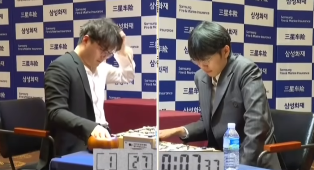 当时棋局已到尾声,廖元赫已经进入读秒许久,此前他一直把西装抱在胸前,突然他起念利用申真谞思考的时间穿上西装,未曾想刚套上右边的袖子,那边就落子了,他没时间接着穿,就这样穿着半件西装接着作战,半边深色西装、半边白色衬衣,恰和棋枰上的黑子白子遥相呼应。
