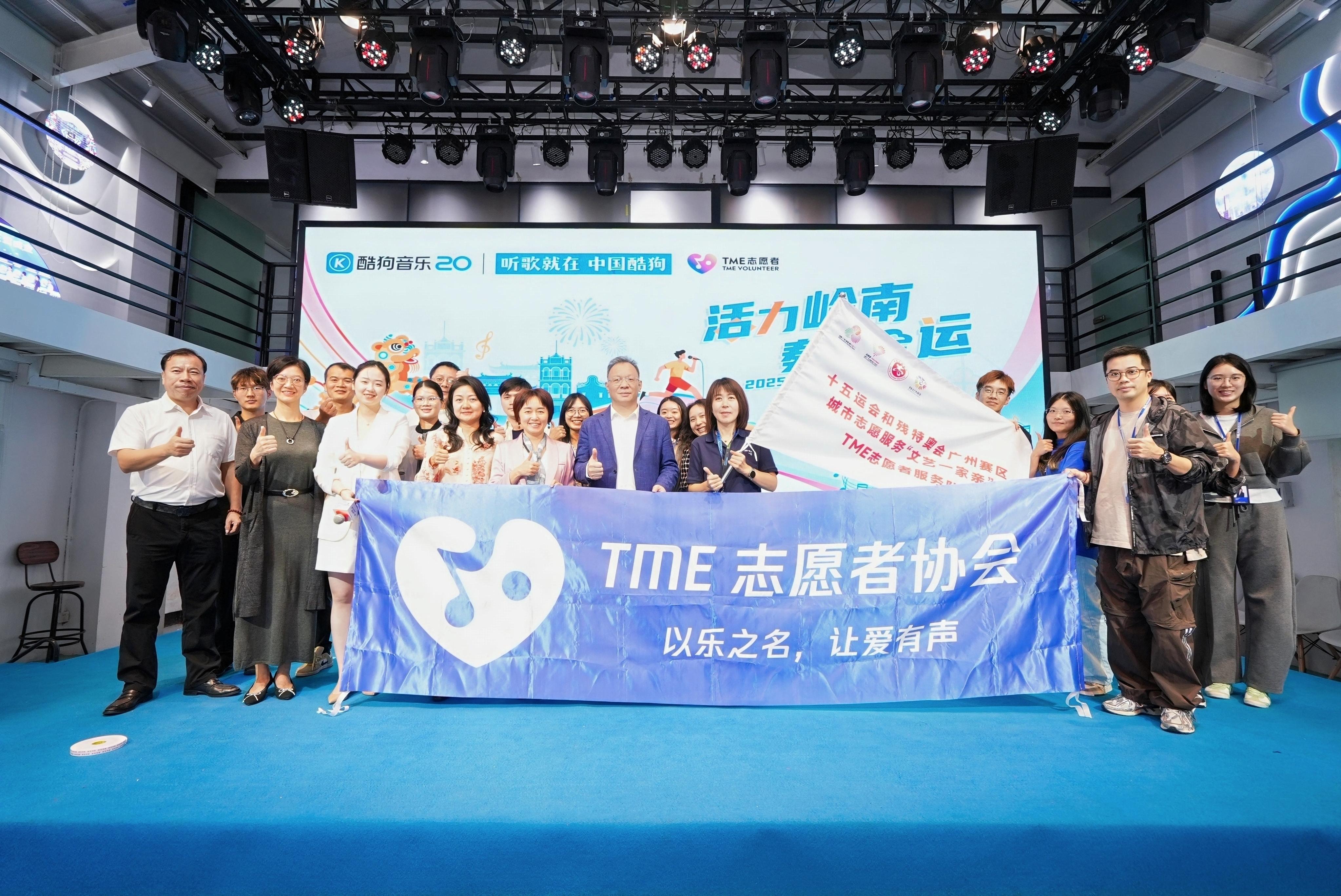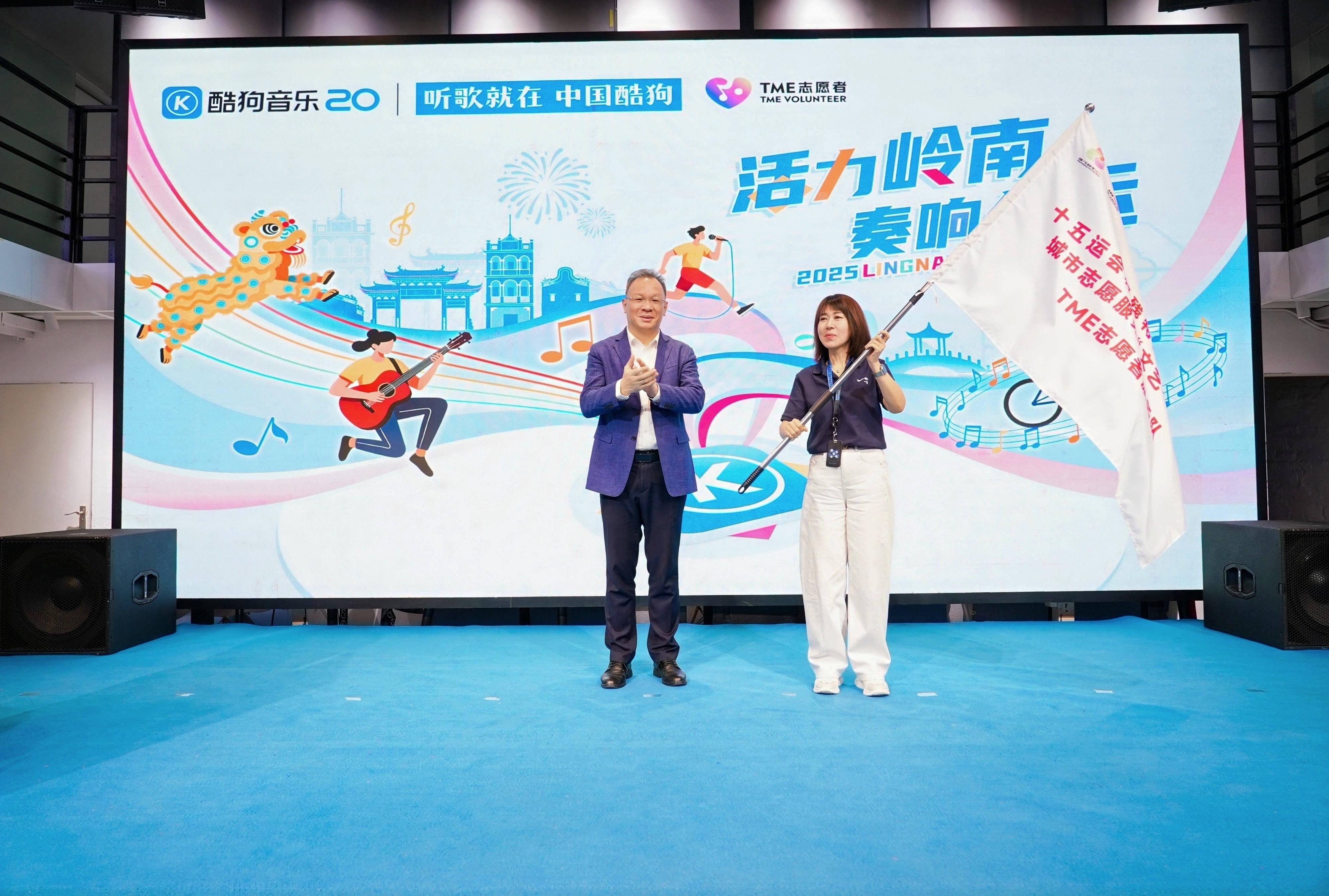 在与会嘉宾的共同见证下,十五运会和残特奥会广州赛区城市志愿服务“文艺一家亲”TME志愿者服务队授旗仪式举行,广州市文联党组成员、专职副主席皮健上台授旗,腾讯音乐娱乐集团内容运营高级总监、酷狗运营负责人李玲玲接过旗帜,承诺队伍将以“音乐+科技”为特色,深度融合岭南文化,打造 AI 合唱、数字音乐市集等特色项目,以多元创新方式致敬体育精神,为十五运会注入艺术活力。