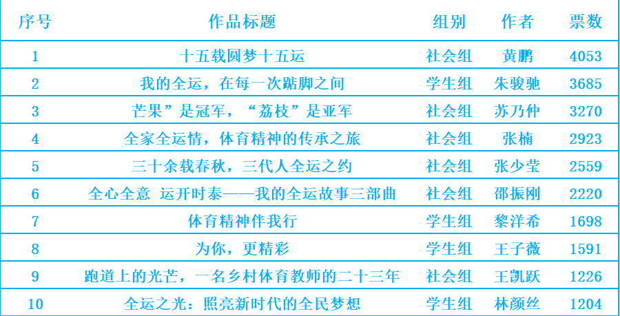经过线上投票,来自社会组的作品《十五载圆梦十五运》以4053票脱颖而出,成为“我们的全运故事”全民征文大赛的“人气王”!激动人心的颁奖仪式即将到来,届时将会有全运彩蛋恭候获奖选手。
