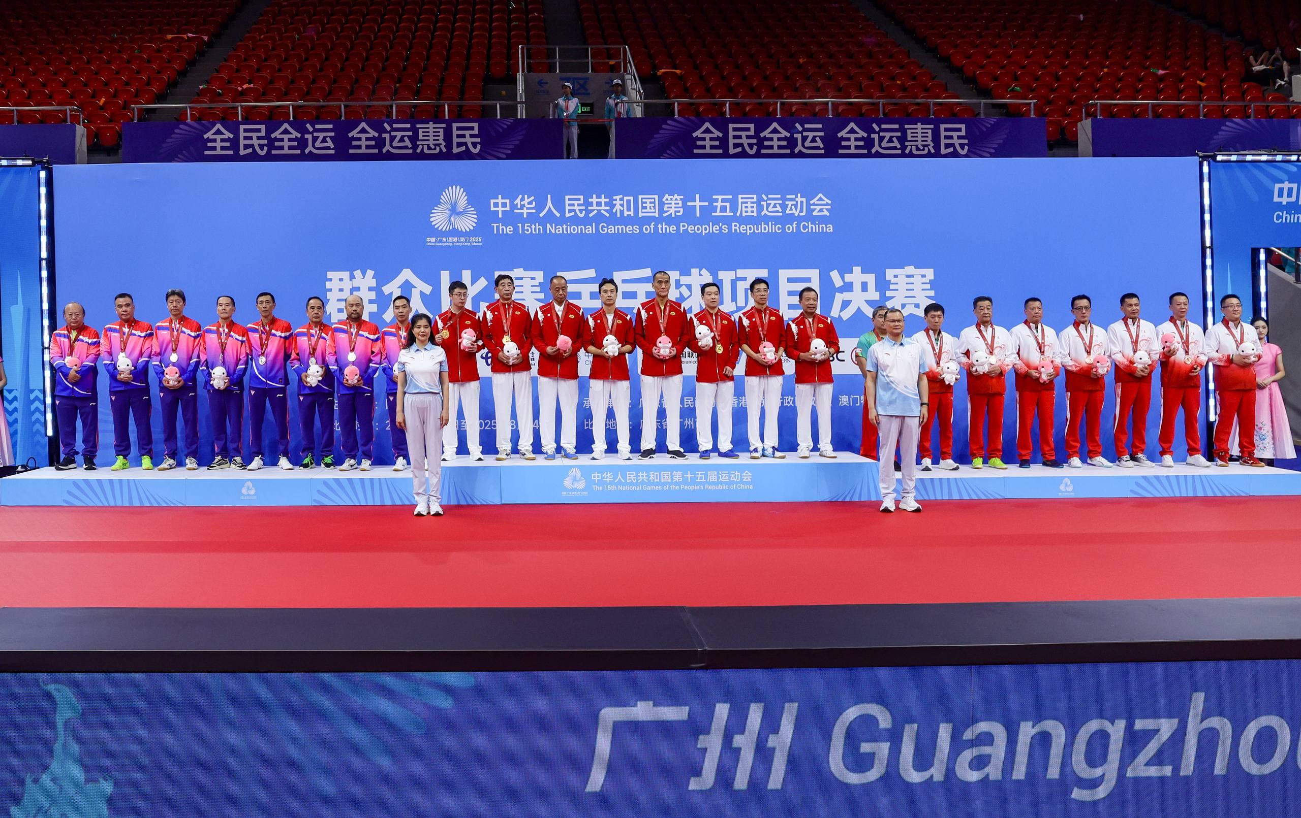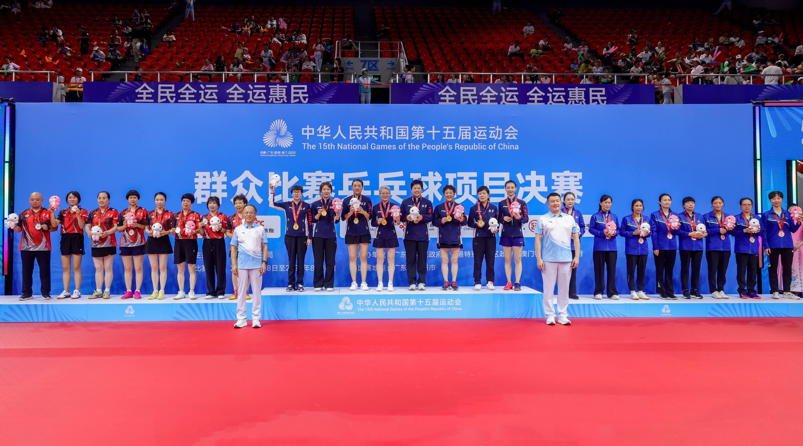 第十五届全国运动会群众比赛乒乓球项目决赛于8月11日晚上在广州天河体育中心体育馆决出男子团体与女子团体冠军。在男团决赛上,河南队以3比2险胜上海队,首夺金牌。在女团决赛上,北京队以3比1力克重庆队,同样首次登上最高领奖台。